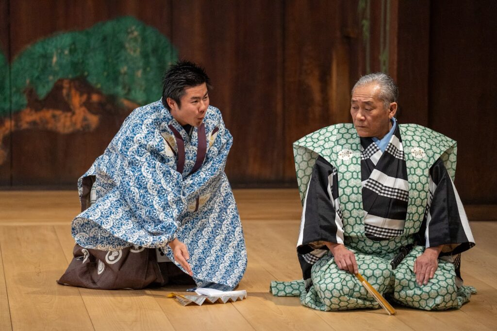 Here is one of Kyogen’s most striking features: the stage is almost completely bare. There are no sets, no elaborate props, no microphones. A single fan becomes a wine cup, a writing brush, a key. The sound of a heavy door closing is made — quite seriously — by the performer’s own voice, in a stylized onomatopoeia that somehow works perfectly.