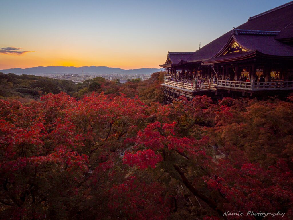 One of Kyoto’s most iconic landmarks. The valley surrounding the famous wooden stage (Kiyomizu-no-Butai) turns a stunning red.