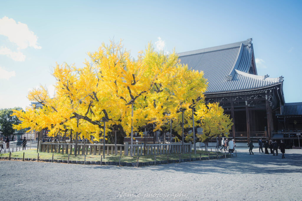 Nishi Hongan-ji is famous not for maple leaves but for its enormous ginkgo trees. When the leaves begin to fall, the entire temple grounds transform into a glowing “golden carpet,” creating a magical late-autumn scene that is especially photogenic.