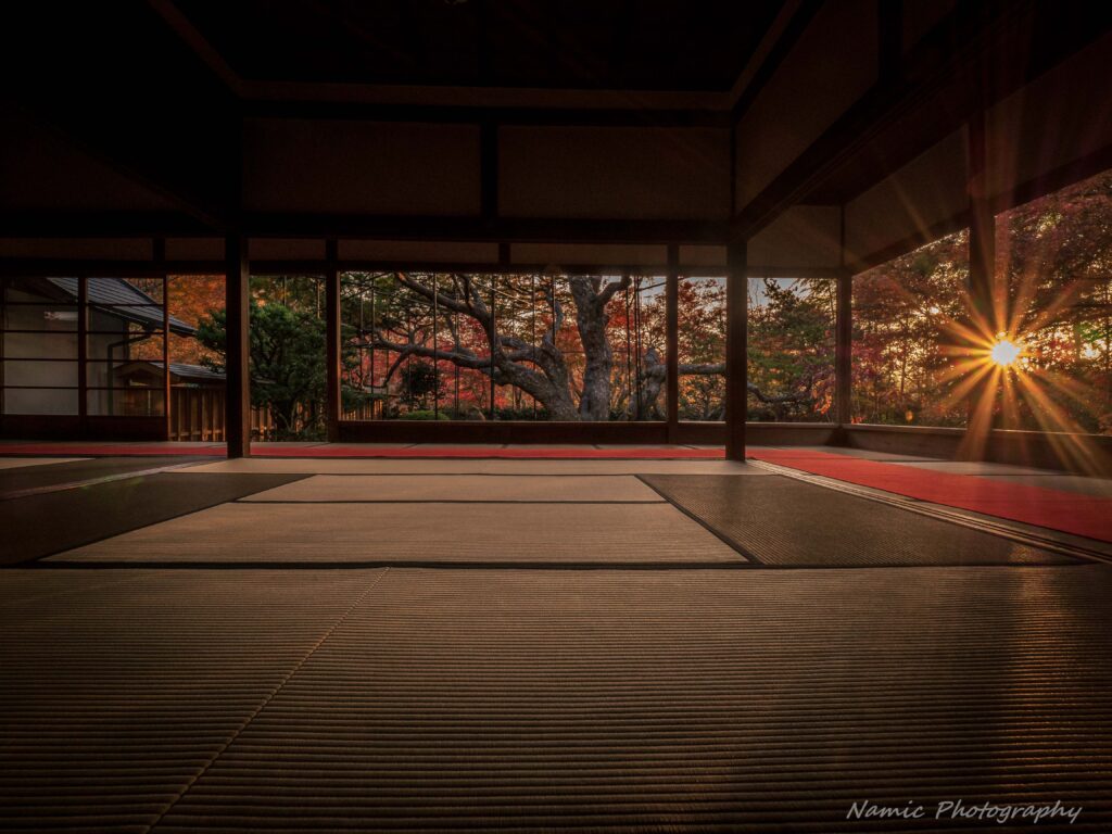 Brilliant maples blending with bamboo groves and mountains, the 700-year-old Goyo pine, and peaceful gardens enjoyed with matcha and sweets.