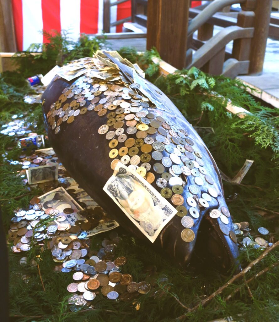 During Toka Ebisu, visitors place coins directly onto the tuna while praying.